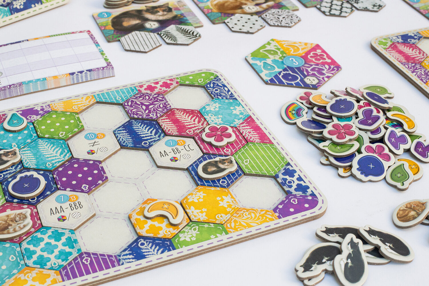 Calico is a puzzly tile-laying game of quilts and cats. In Calico, players compete to sew the coziest quilt as they collect and place patches of different colors and patterns. Each quilt has a special pattern that must be adhered to, and players are also trying to create color and pattern combinations that are not only aesthetically pleasing, but also able to attract the cuddliest cats.